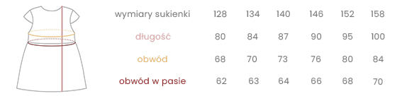 Sukienka dostępna do zamówienia w standardowych rozmiarach dopasowanych do wzrostu od 128 do 152 lub w opcji szycia na wymiar.