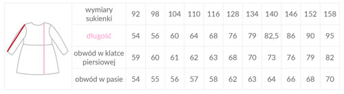 Sukienka dostępna do zamówienia w standardowych rozmiarach dopasowanych do wzrostu od 92 do 158. Ze względu na dopasowany krój przed zamówieniem prosimy o sprawdzenie wymiarów sukienki, które znajdziecie powyżej w zakładce WYMIARY.